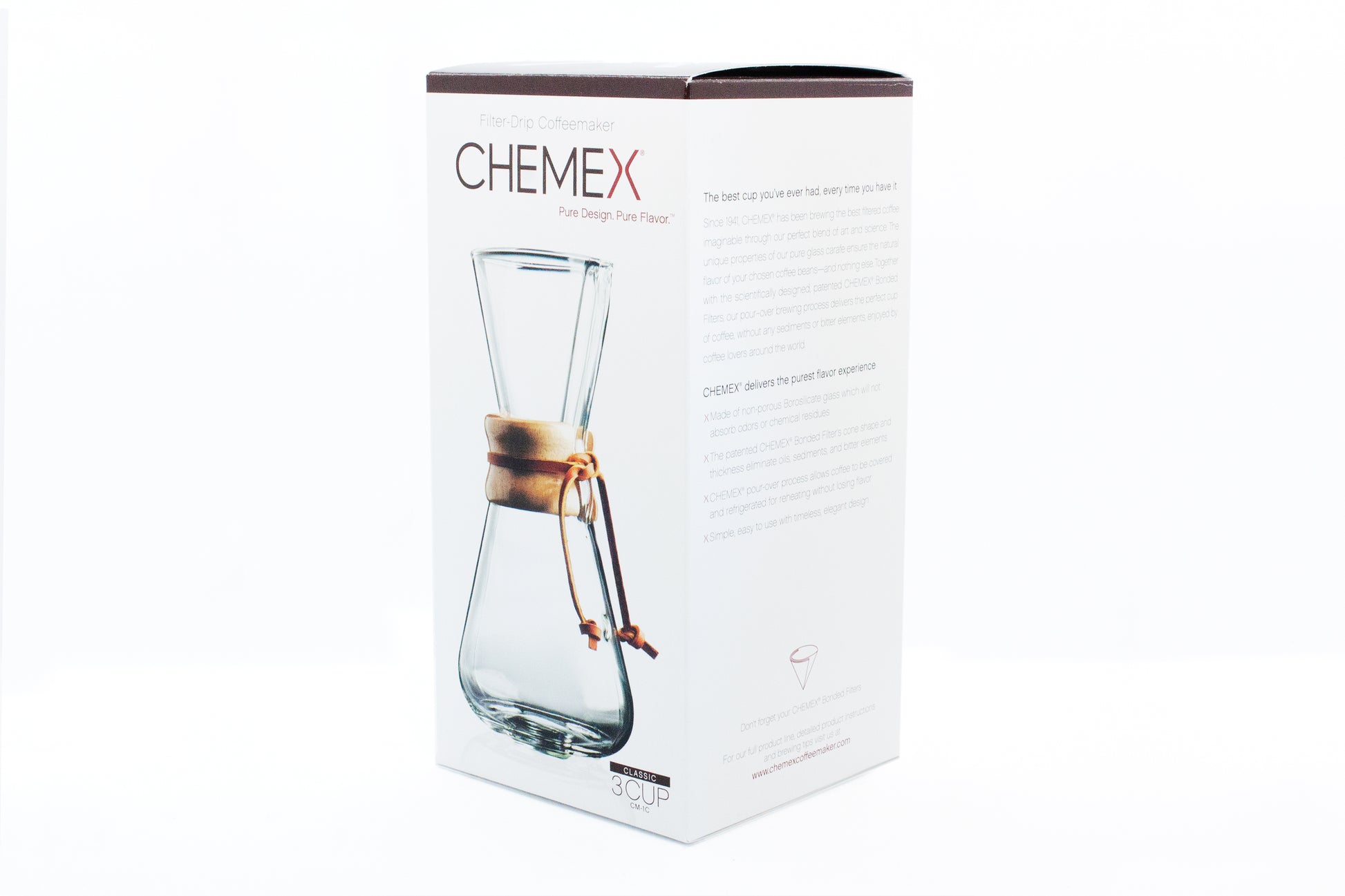 Designed in 1941 by renowned designer Peter Schlumbohm, the Chemex bought soft brewing coffee to the masses. Made from sturdy heat resistant glass, the Chemex creates a clean cup of coffee over and over again. This Chemex can brew up to 300ml or 3 cups of coffee. Filter papers are sold separately.