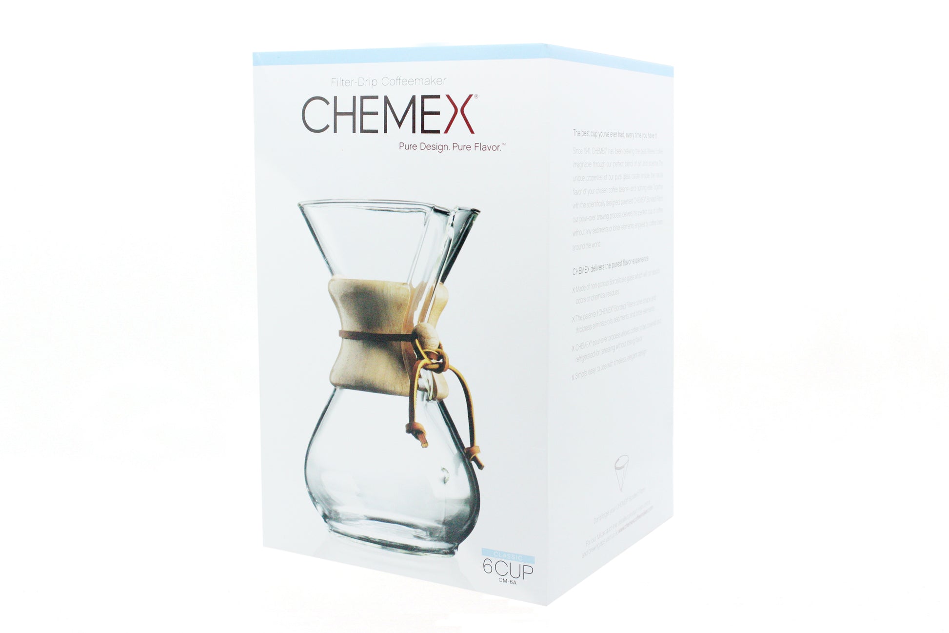 Designed in 1941 by renowned designer Peter Schlumbohm, the Chemex bought soft brewing coffee to the masses. Made from sturdy heat resistant glass, the Chemex creates a clean cup of coffee over and over again. This Chemex can brew up to 900ml or 6 cups of coffee.
