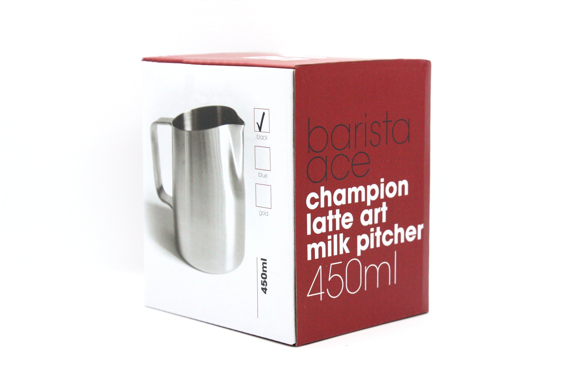 Barista Ace Champion Latte Art milk jug. Achieve precise pouring action from the angled spout like a Pro.
